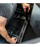 The RAM® Universal No-Drill™ Laptop features a heavy-duty steel mounting base designed to fit a variety of vehicles. Using the front bench or passenger side seat rail bolts as attachment points, existing hardware is used to secure the laptop mount base in the vehicle. The included RAM Tough-Tray™ is spring loaded to accommodate 10" to 17" laptops. The tray features four adjustable retaining arms with rubber grips. These arms can be moved both vertically and horizontally, enabling a custom fit for varying thicknesses of laptops and access to ports or drives. A screen support and USB light are also available to accessorize the tray. Hole patterns on perimeter of tray facilitate the mounting of additional RAM systems to support phones or other electronics.